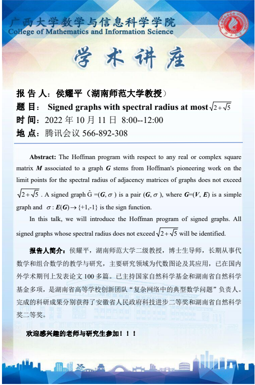 学术报告:igned graphs with spectral radius at most $\sqrt{2+\sqrt{5}}$