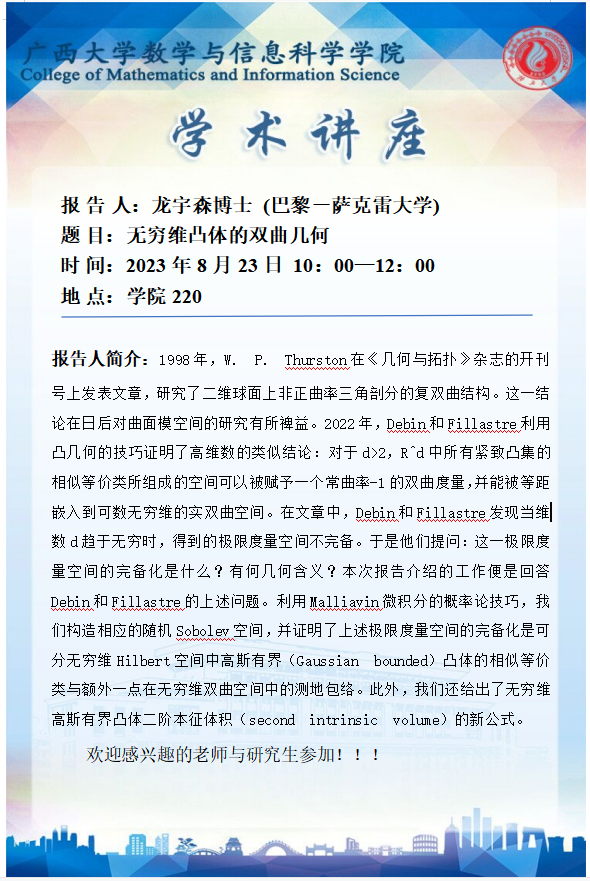 学术报告:无穷维凸体的双曲几何