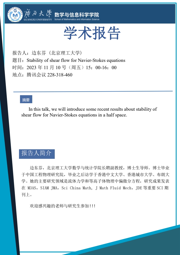 学术报告:Stability of shear flow for Navier-Stokes equations