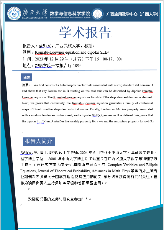 学术报告:Komatu-Loewner equation and dipolar SLE
