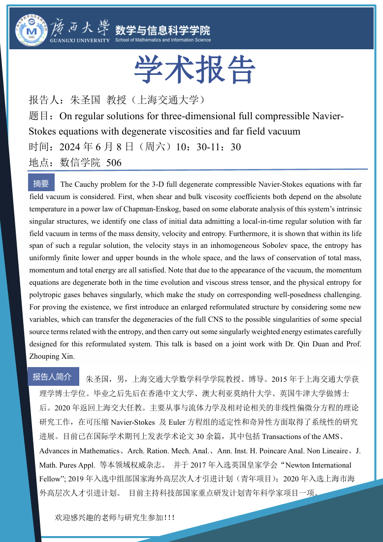 学术报告:On regular solutions for three-dimensional full compressible Navier-Stokes equations with degenerate viscosities and far field vacuum