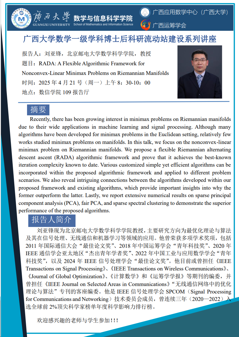 学术报告:RADA: A Flexible Algorithmic Framework for Nonconvex-Linear Minimax Problems on Riemannian Manifolds