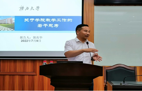 教学工作大会分为报告会和座谈会两个阶段进行。首先,大会特别邀请了华中师范大学数学与统计学院副院长郑高峰教授和代晋军副教授分别就教育信息化和智慧教学作了专题报告。随后,学院领导班子成员与教师代表就相关教学问题展开了积极对话与交流。广西大学发展规划处处长、副教务长赵双良,教务处处长耿葵花,数学与信息科学学院领导班子成员及全体教职工参加了本次大会。