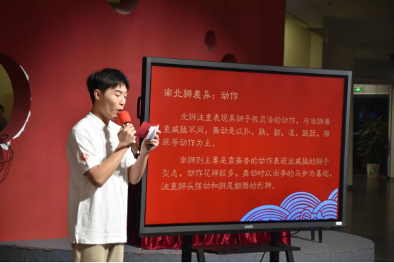 数学与信息科学学院龙狮协会率先带来醒狮舞狮表演,现场高亢激昂的鼓乐声和活泼灵动的舞狮,引来观众阵阵喝彩。在文化科普环节,协会负责人还讲述了龙狮文化的起源、历史发展和流派概况,讲解了基础的舞狮动作要领和鼓乐节奏,并邀请观众现场学习体验舞狮技巧,感受中国龙狮文化的丰富内涵,感知中华优秀传统文化的独特魅力。