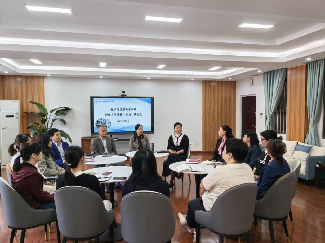 为进一步提升学院行政管理人员的执行力、战斗力、亲和力,12月4日上午,学院组织全体行政人员在学院220会议室召开了以提升“三力”为主题的恳谈会。学院党委书记吴华丽,党委副书记、纪委书记唐旭彬,副院长石志刚出席会议,学院全体行政管理人员参加了会议,会议由石志刚主持。