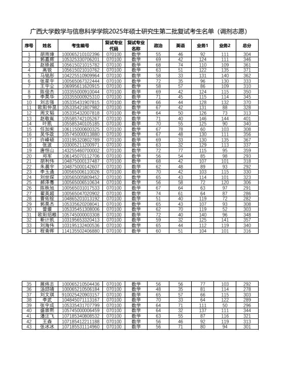 广西大学数学与信息科学学院2025年硕士研究生第二批复试考生名单(调剂志愿)