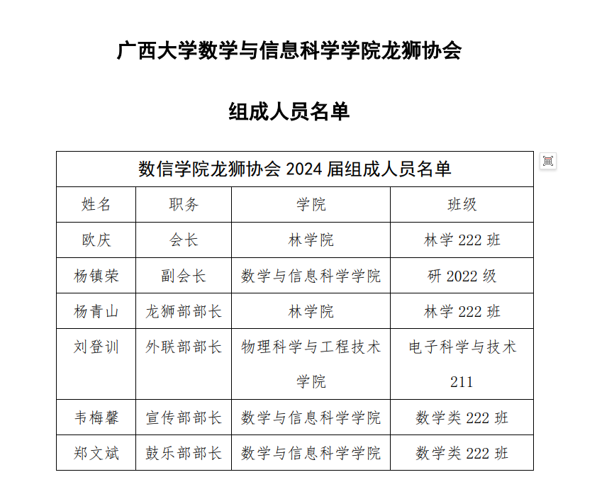 广西大学数学与信息科学学院龙狮协会 组成人员名单