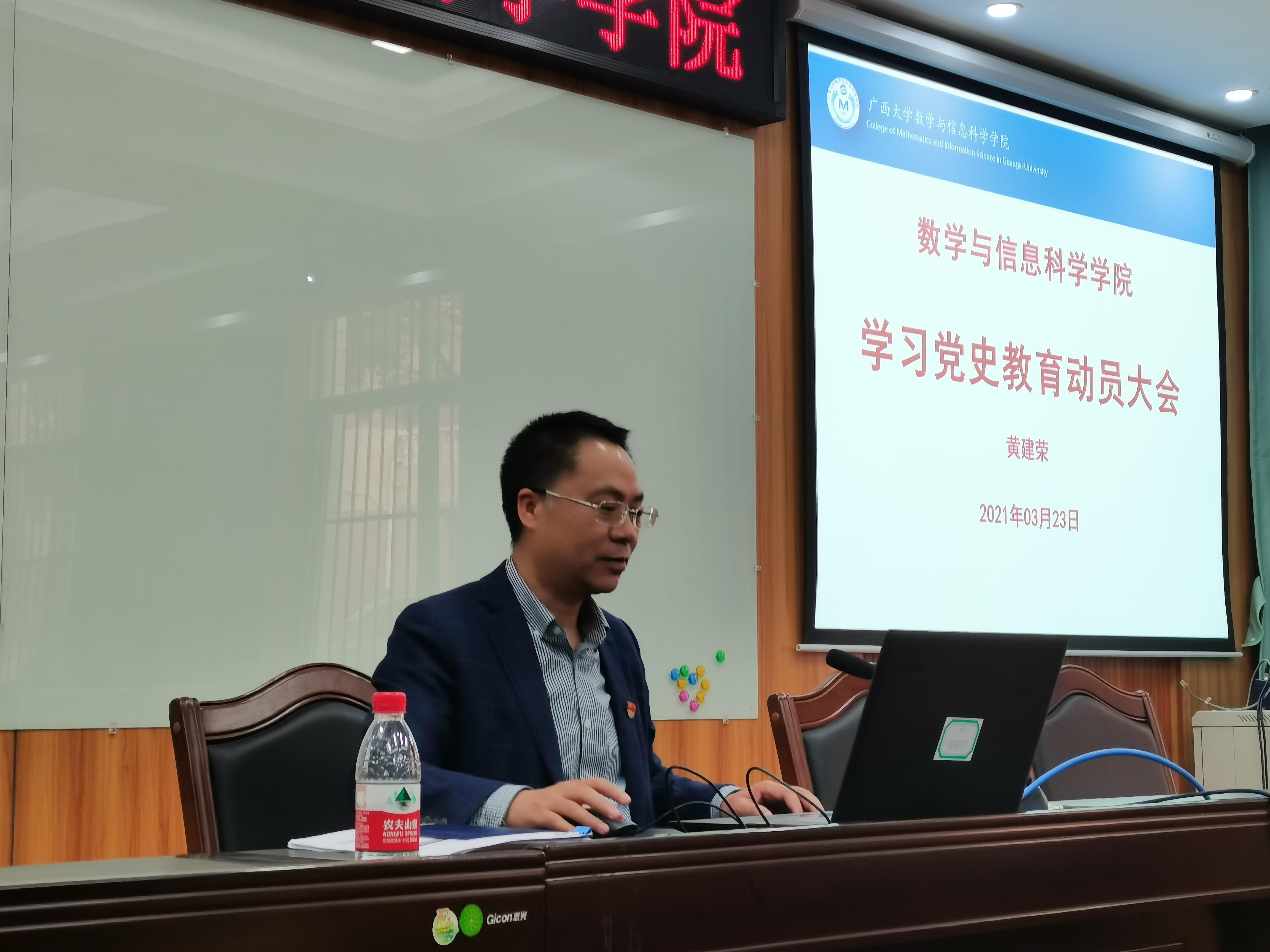 2021323日下午,数信学院党史学习教育动员大会在学院一楼报告厅召开。院党委书记黄建荣出席会议并作动员讲话,院党委委员及全体教职工党员和学生党支部委员参加了动员大会。
